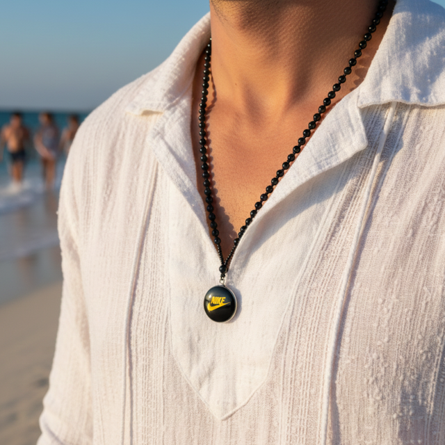 Der Mittelpunkt dieses außergewöhnlichen Schmuckstücks ist der runde, kreisförmige Anhänger mit dem berühmten Nike-Logo (Swoosh) in goldener Farbe auf schwarzem Hintergrund.
